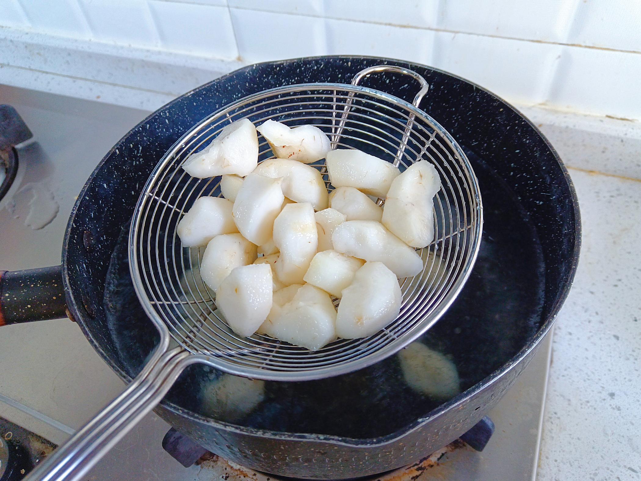 2、起鍋燒水,水開倒入馬蹄焯水,大火煮30秒撈出。