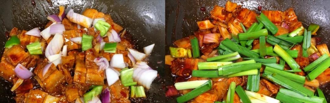 5、接着倒入蒜苗杆炒一分鐘,最後倒入蒜苗葉,加蠔油、適量鹽、雞精翻炒均勻就能出鍋了。