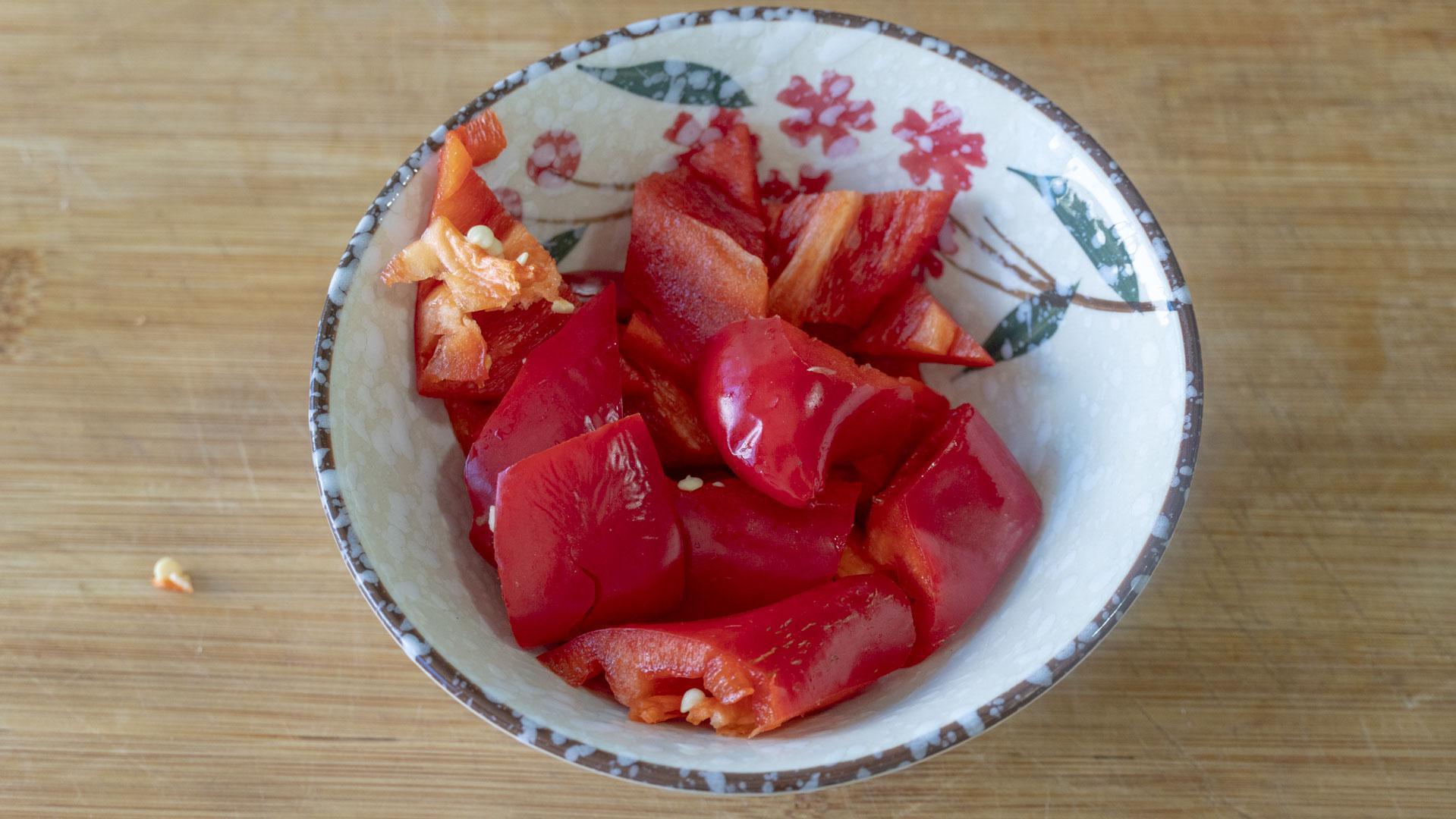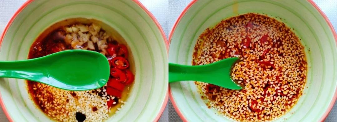 1、調料汁:蒜末、辣椒粉、小米椒、芝麻、淋入熱油、少許鹽、半勺糖、3勺生抽、2勺香醋、半勺麻油調勻。