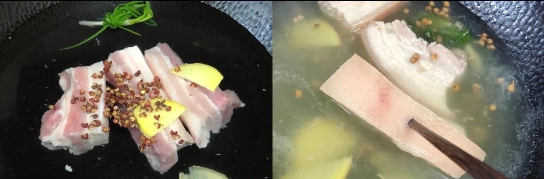 1、五花肉冷水下鍋,加入蔥姜,花椒,料酒,大火煮開轉中火煮至筷子插透肉皮,大約分鐘左右。