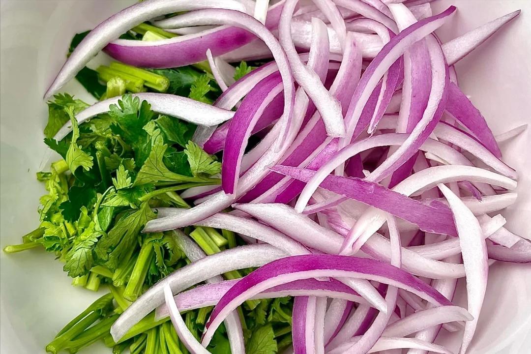3、切好的洋蔥絲放入冷水中加1勺鹽浸泡10分鐘。