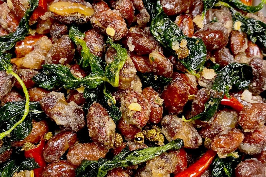 3、鍋中不到油,倒入炸好的紅豆、苦菜,加入胡椒粉、花椒粉、雞粉、辣椒麪、鹽翻拌入味即可撈出。
