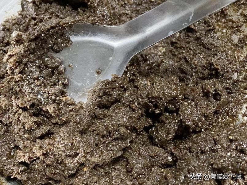 3、將蜂蜜分幾次加入黑芝麻粉中,邊倒邊攪拌,直至黑芝麻粉能完全黏在一起;