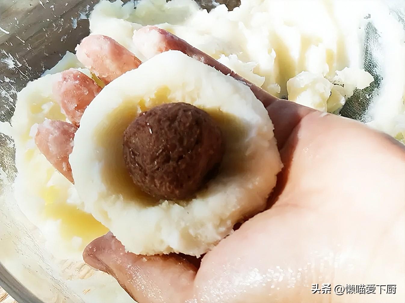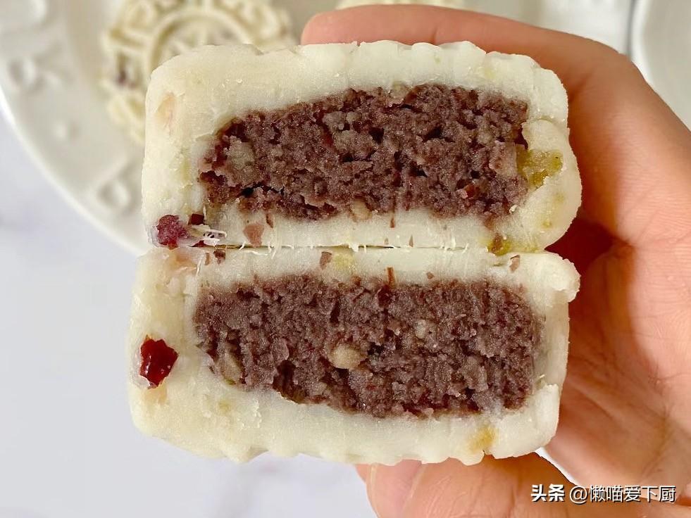 4、中間放入適量紅豆餡,再包裹起來,用模具壓成型,即可享用。