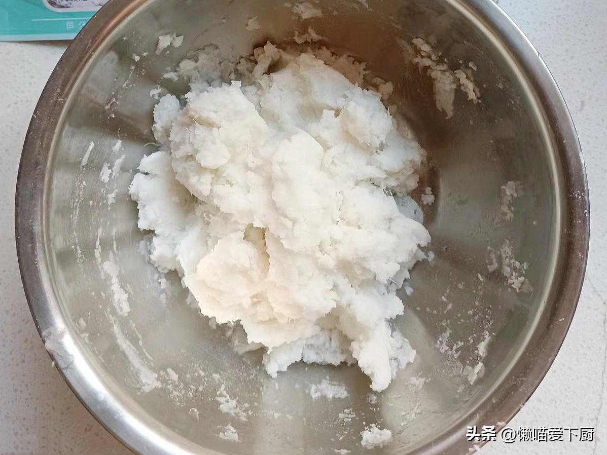2、往山藥中加2勺糯米粉揉成光滑的麪糰,如果覺得黏手可以再加點食油;