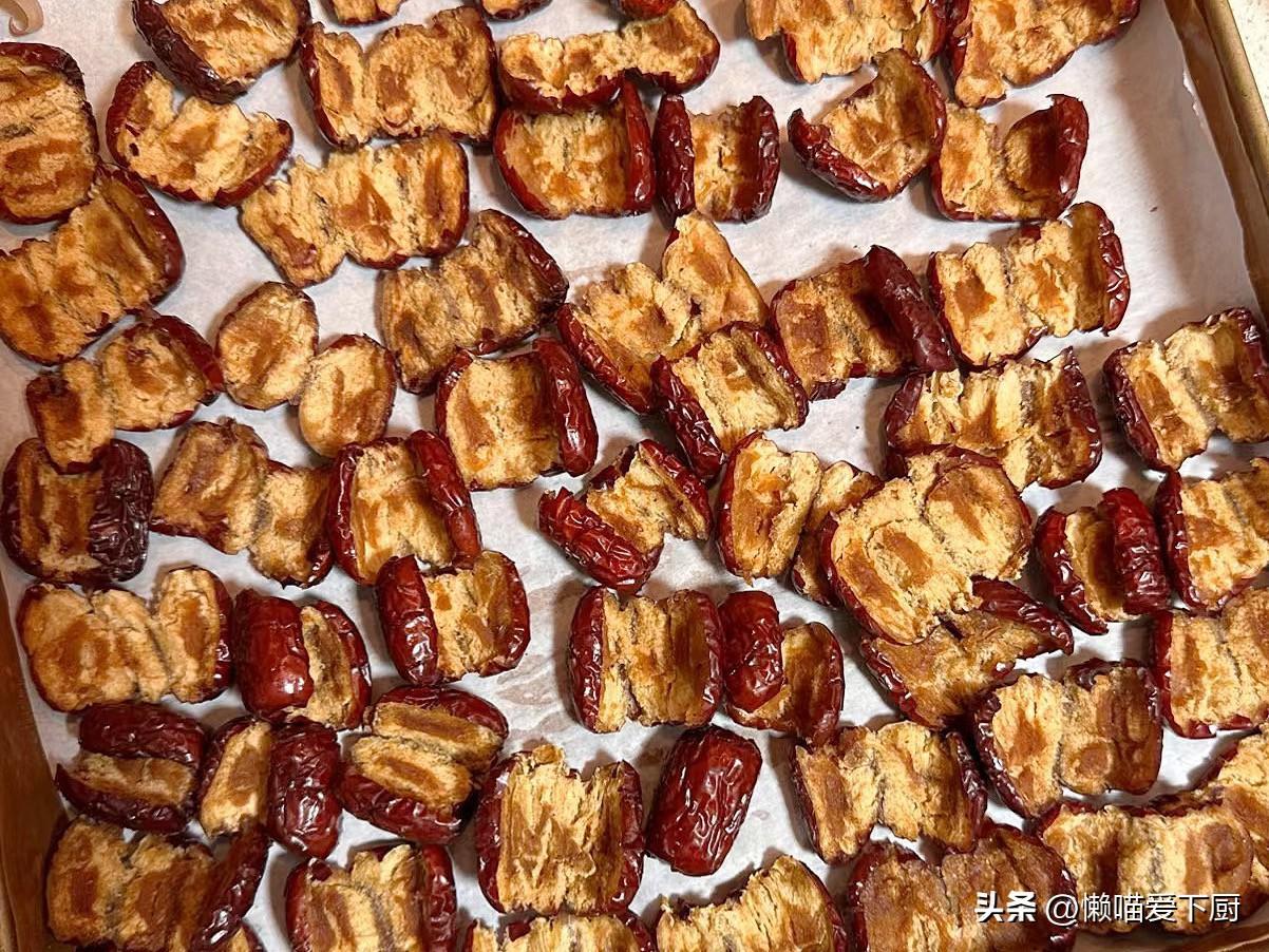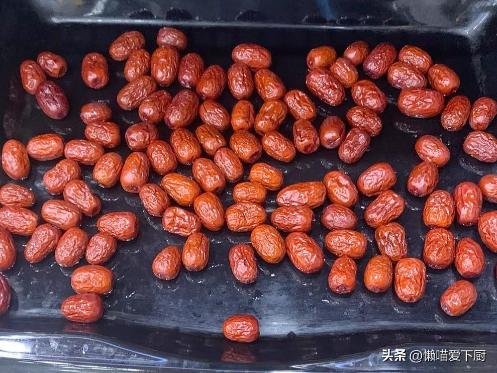 1、紅棗洗淨後控幹水分,放入烤箱或空氣炸鍋中,150度烤12分鐘;