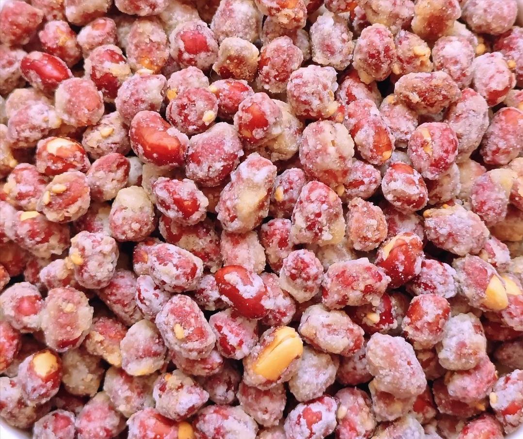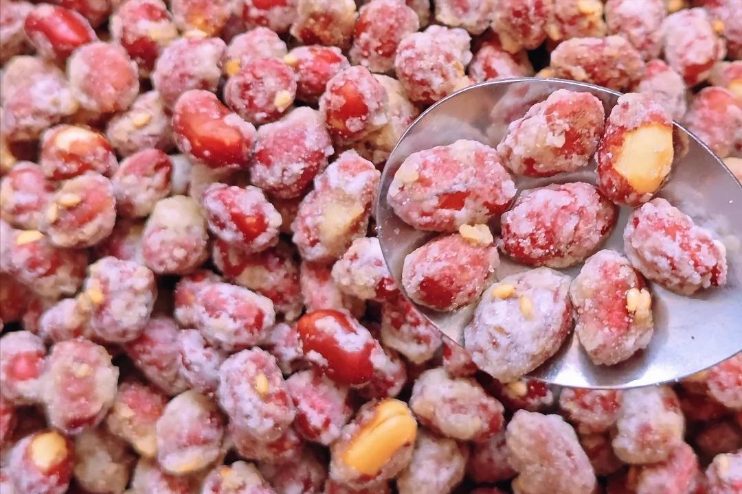5、3-5分鐘後倒入炸好的花生米,裹上糖霜,撒上白芝麻,翻炒均勻即可。