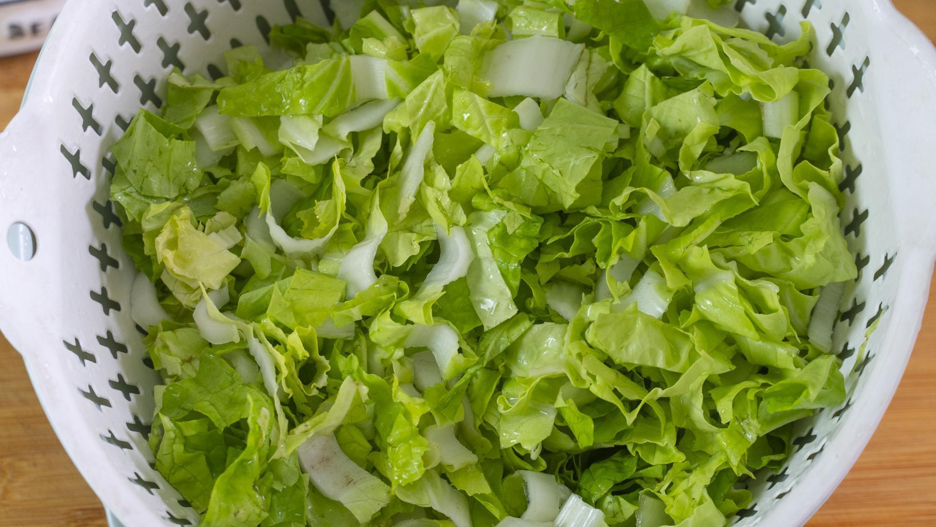 3、火腿一小塊,清洗乾淨切小丁;小白菜兩顆,清洗乾淨後切絲。