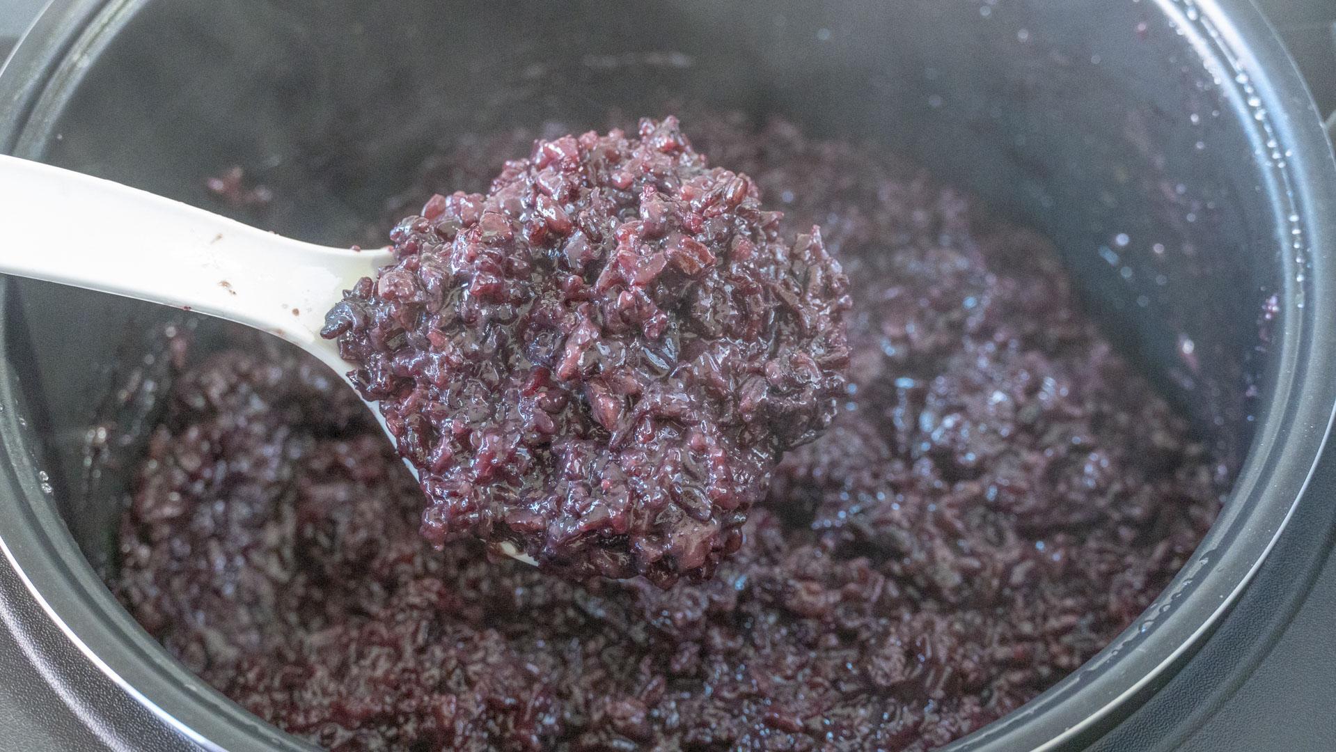 3、第二天先把糯米和黑米瀝乾水分,然後一起倒入電飯鍋中,加入和煮飯一樣多的清水,蓋上蓋子按下煮飯鍵。蒸熟後趁熱加50克白糖,30克黃油、20克煉乳、25克牛奶,翻拌均勻後就是香甜可口的黑糯米飯了,直接喫也非常的好喫。