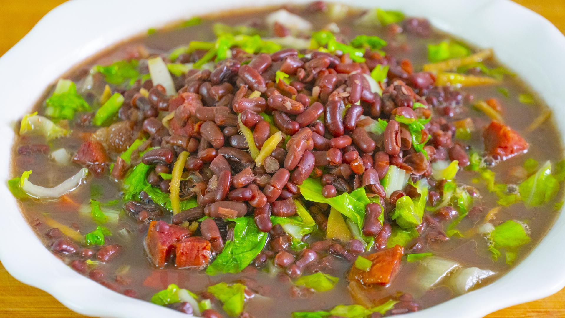 6、最後加入青菜,拌勻後就可以關火了,出鍋前撒點小蔥花,好喫又好喝的紅豆青菜湯就做好了。
