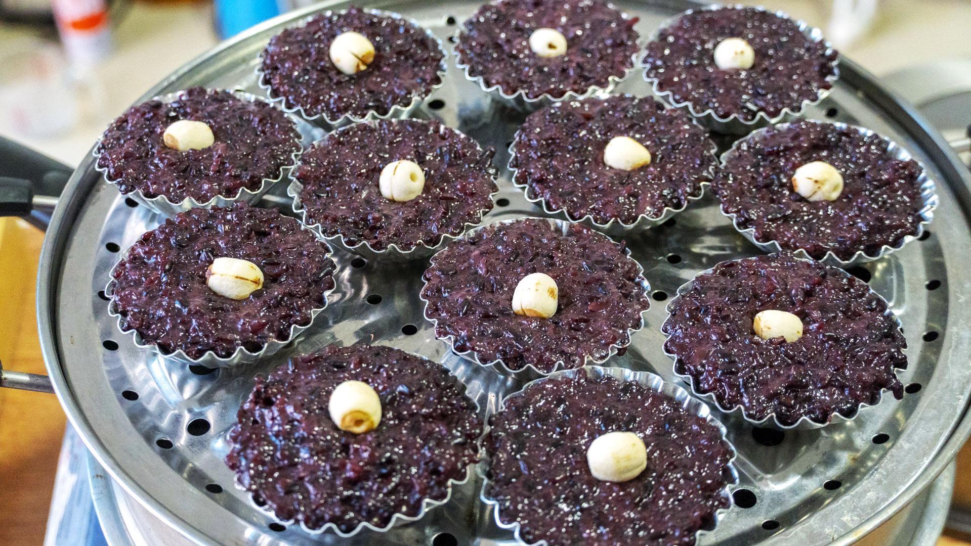 4、把拌好的黑糯米舀入模塊裏,表面抹勻,再放上一顆蓮子。全部做好後放入蒸鍋,大火蒸20分鐘。