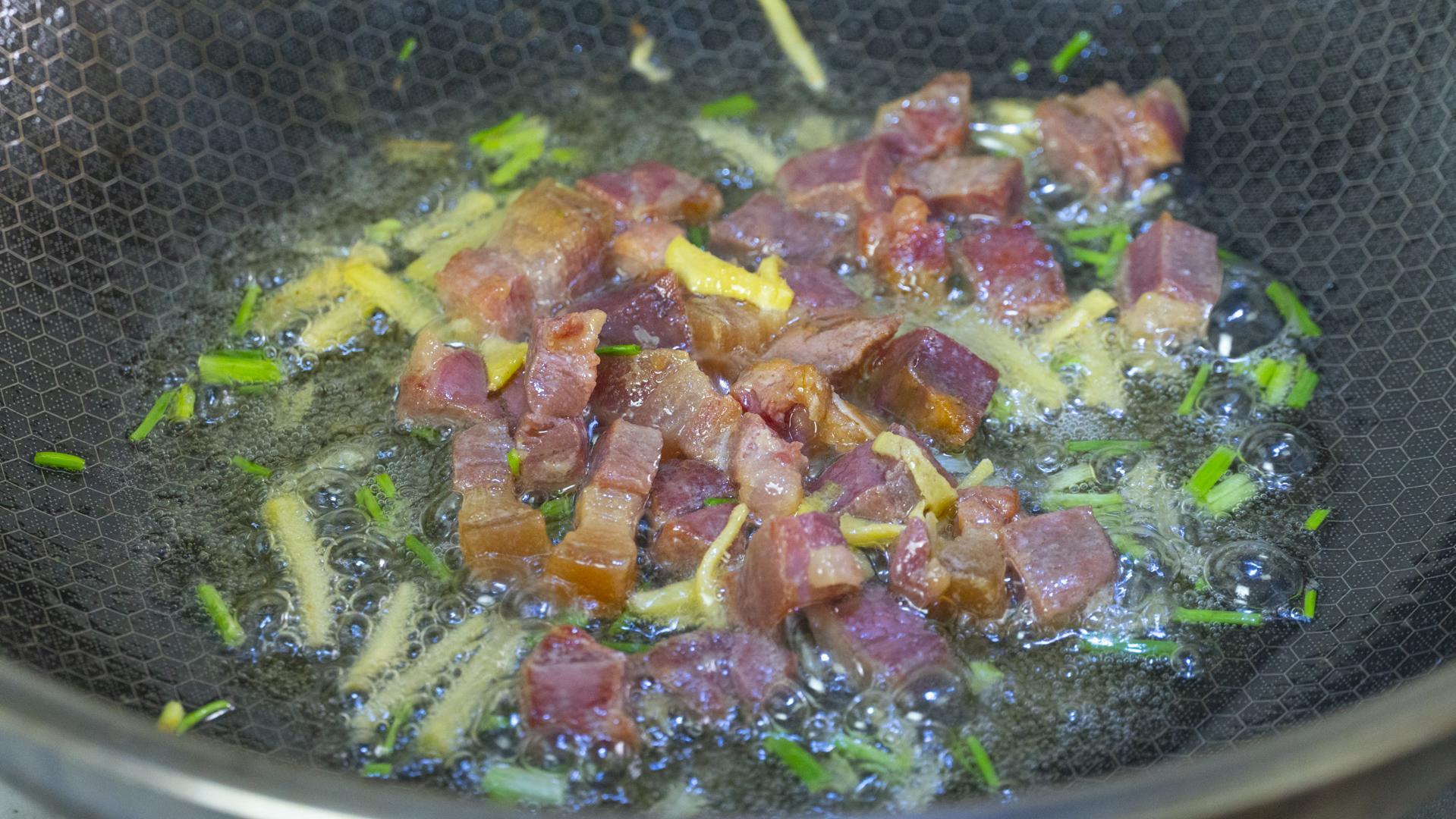 5、起鍋熱油,下火腿炒香,接着把蔥薑蒜也加進來大火爆香。倒入煮好的紅豆,湯也一起倒進來,調味加一勺鹽,一點點的雞精,一勺生抽,接着大火煮開。