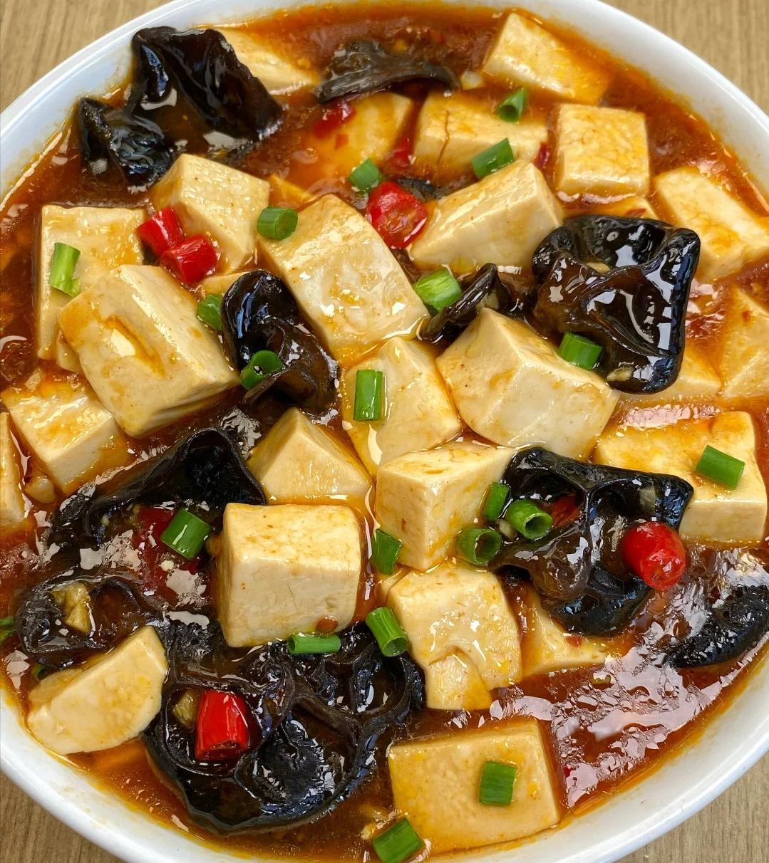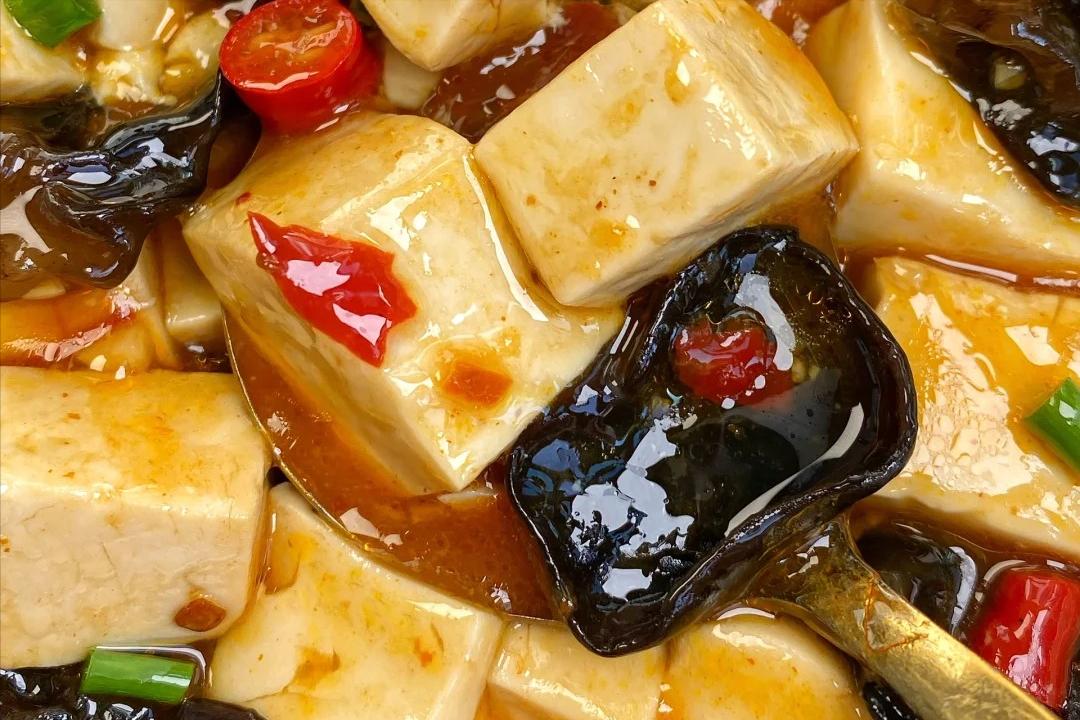 4、將豆腐塊輕輕放入鍋中,儘量不要用鏟子過度翻動,調味加生抽、老抽、鹽、白糖、雞精,輕輕拌勻。