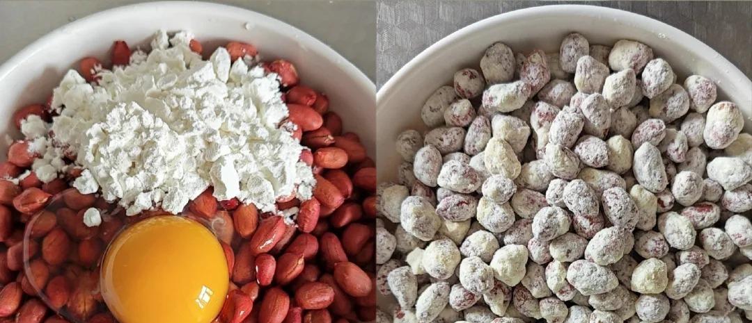 2、打一顆雞蛋後再放150克玉米澱粉,攪拌均勻,讓花生裹上玉米澱粉。