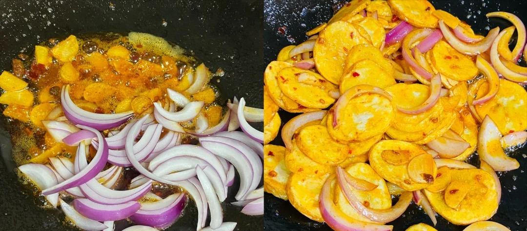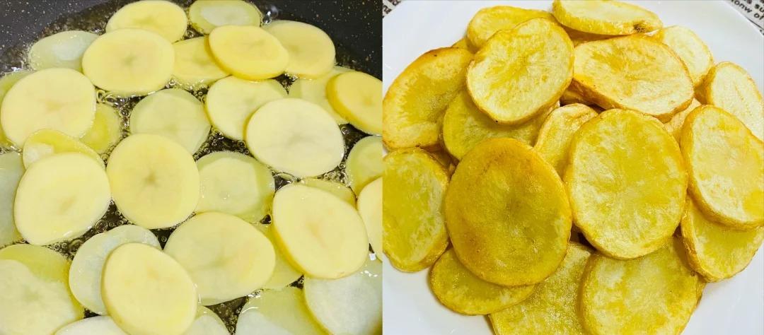 2️、鍋裏放油下土豆片煎至兩面金黃撈出。