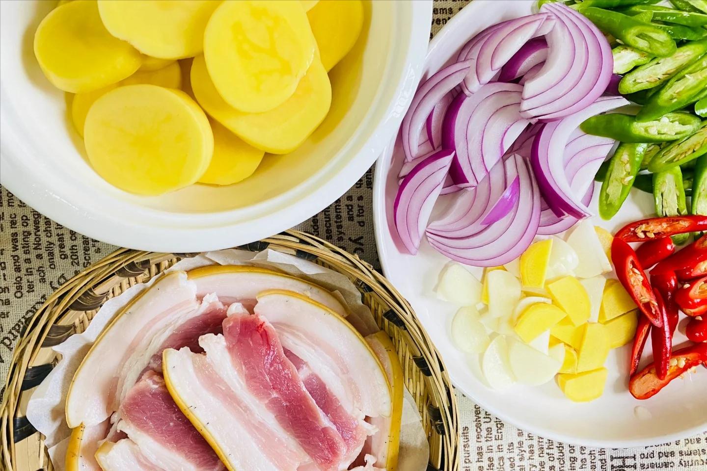 1、五花肉,土豆,洋蔥,青紅辣椒,姜蒜,所有食材洗淨切好備用。