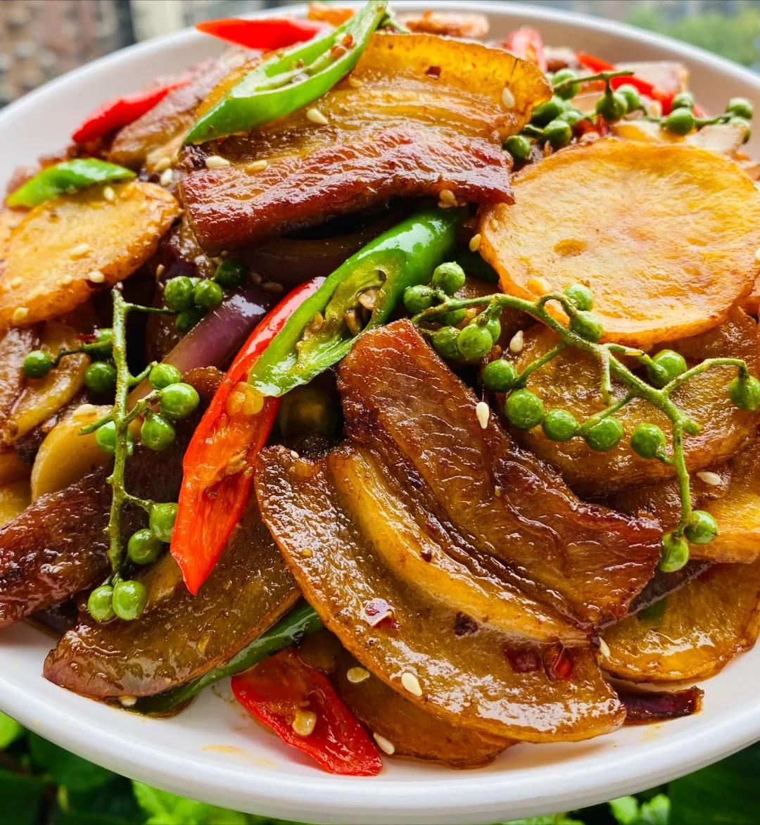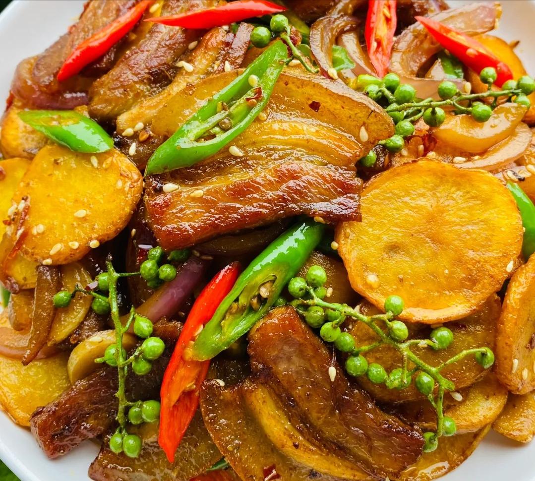 5、再依次放入土豆片五花肉青紅辣椒,鮮花椒,加入適量醬油蠔油調味,起鍋前撒上白芝麻即可。