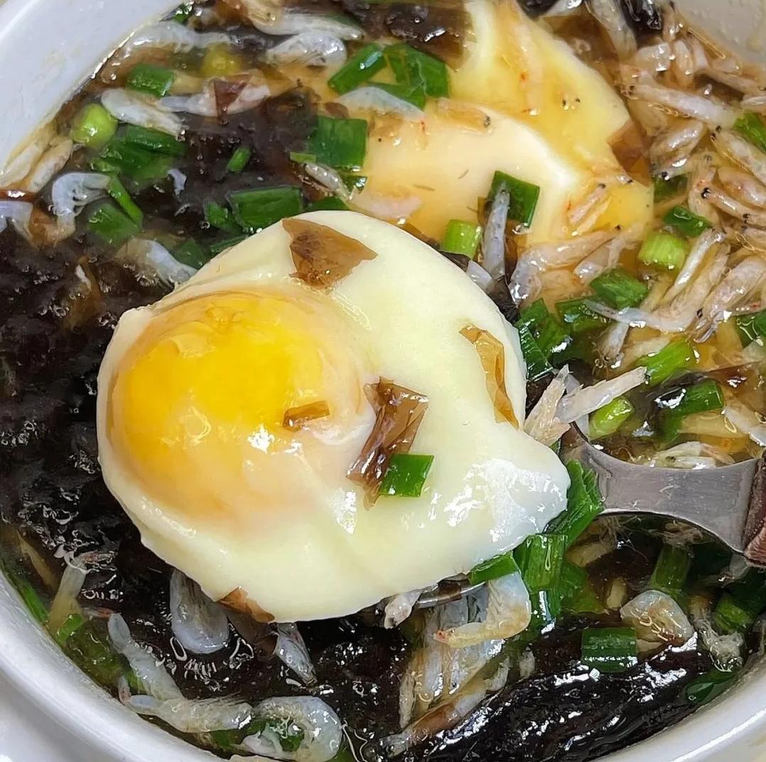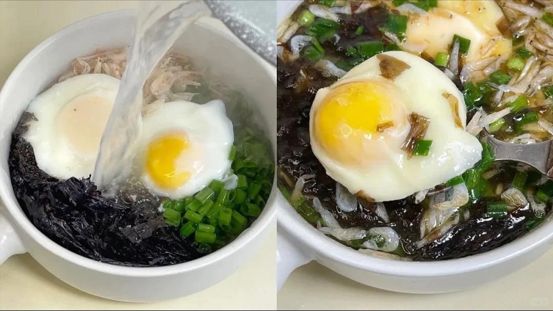 3、煮好後把雞蛋和湯都一起倒入調好湯底的碗中,拌勻就可以喫了。