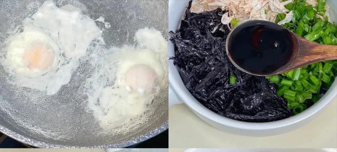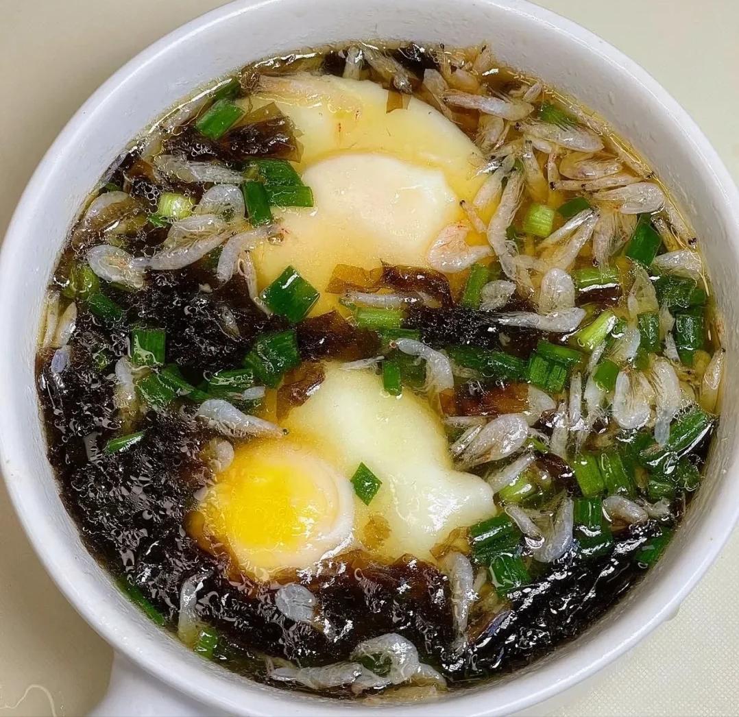 5、今天我是蒸的和煮的都做了一點,煮的話就調點湯底,碗里加點這種蝦皮紫菜之類的,再來點蔥花和豬油,舀兩勺鍋裏的熱湯。