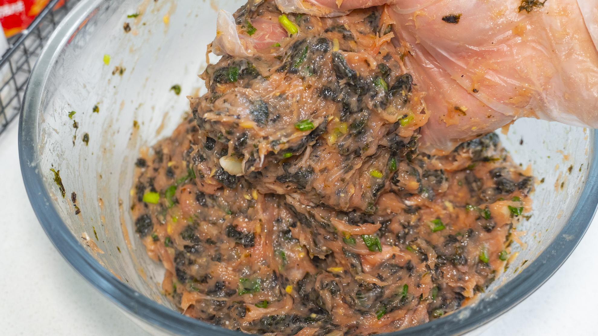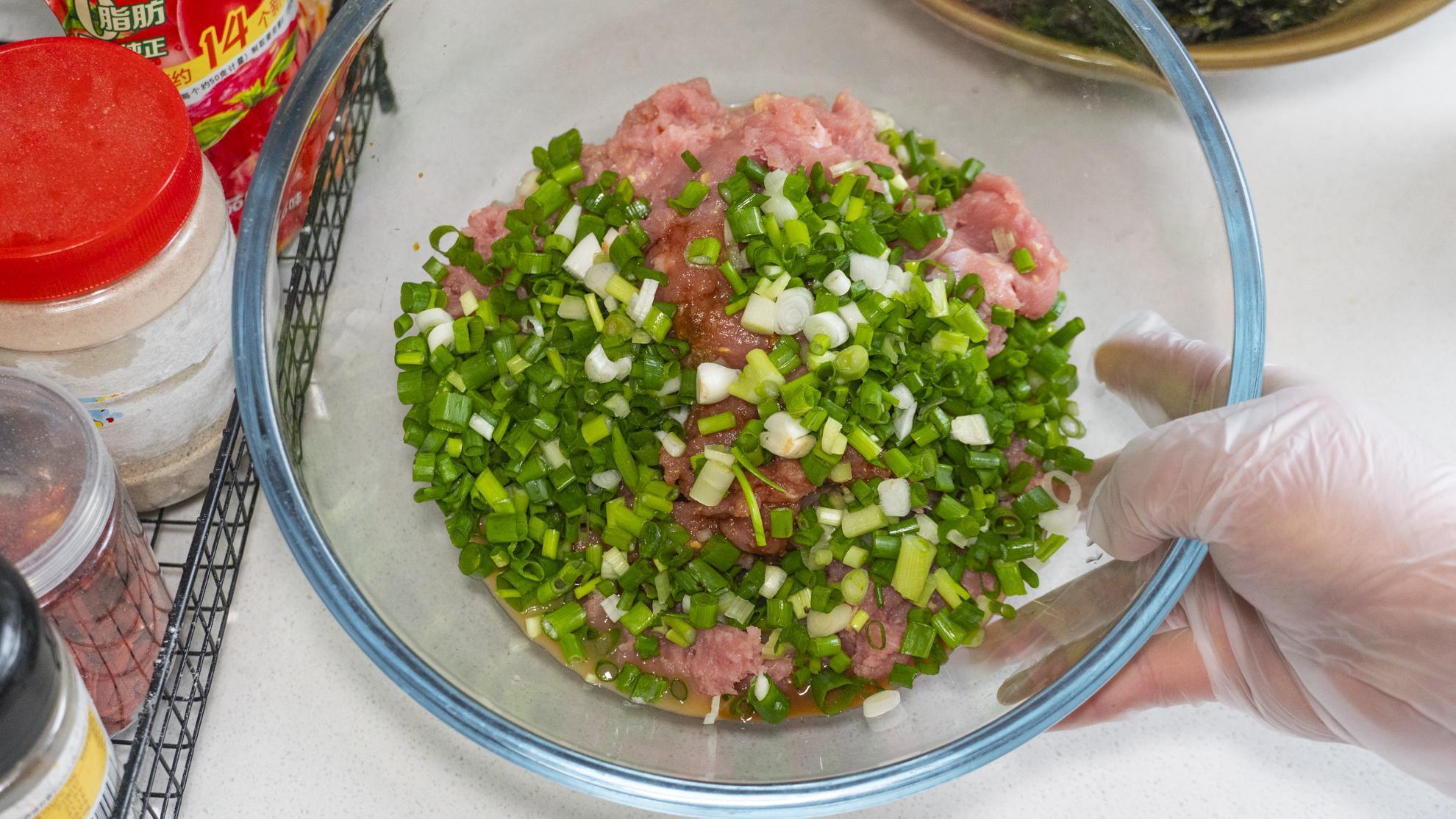 3、攪拌攪拌,把這個肉餡攪上勁兒,最後把紫菜加進來,抓拌均勻,餡兒就調好了,很簡單的。