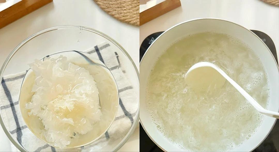 3、先來煮銀耳,冷水下銀耳煮,邊煮邊攪拌,先煮20分鐘左右,讓銀耳出膠。