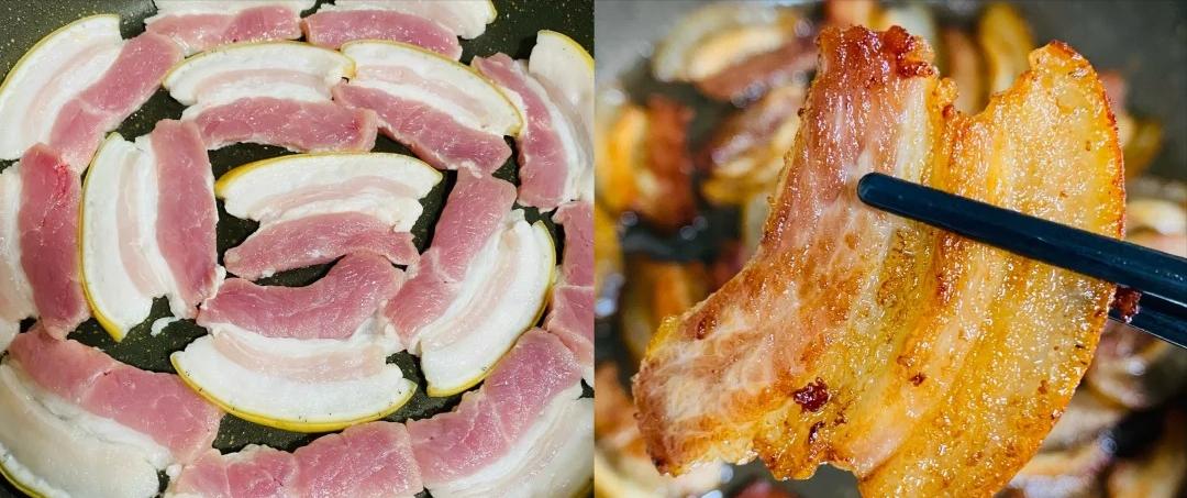 3、鍋裏不放油下五花肉煎出多餘油脂撈出備用。