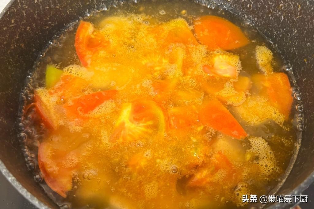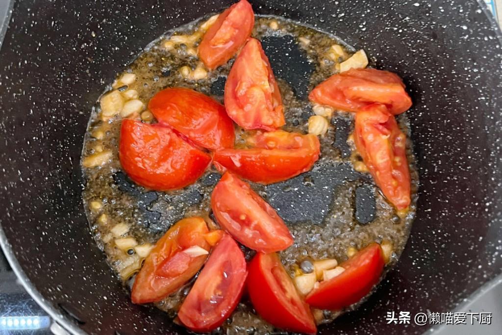 2、鍋中加油,加蒜末炒香,再下入西紅柿,不斷翻炒出汁;