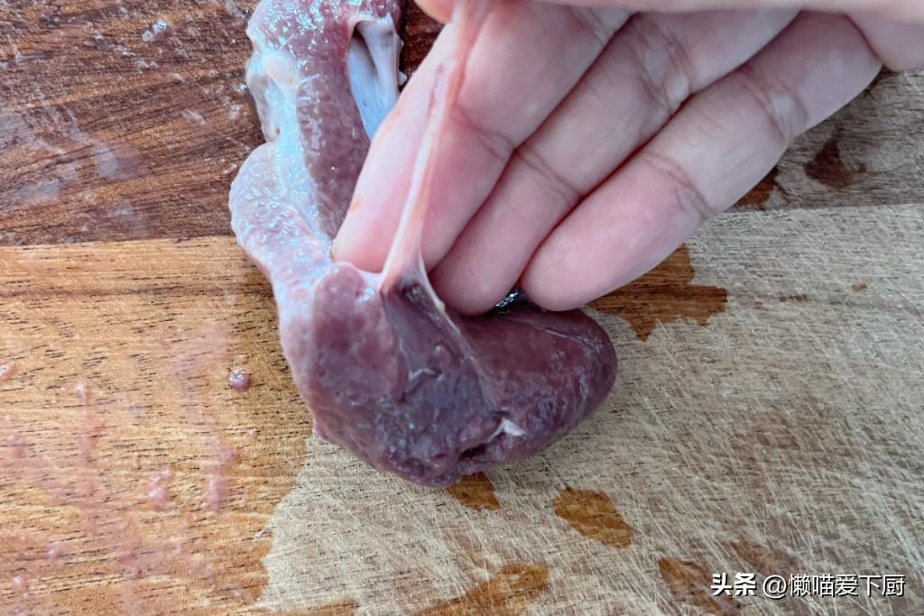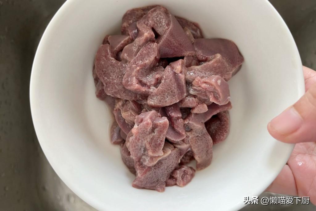 2、往豬肝中加些麪粉,反覆揉搓再衝洗乾淨,然後將豬肝切薄片,加些料酒、生抽、生粉醃製30分鐘;