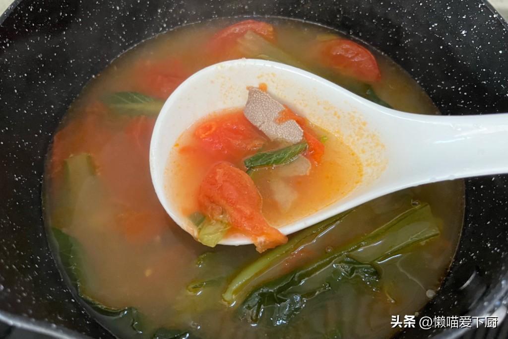 食材:西紅柿、豬肝、青菜、大蒜、料酒、生抽、生粉、食鹽