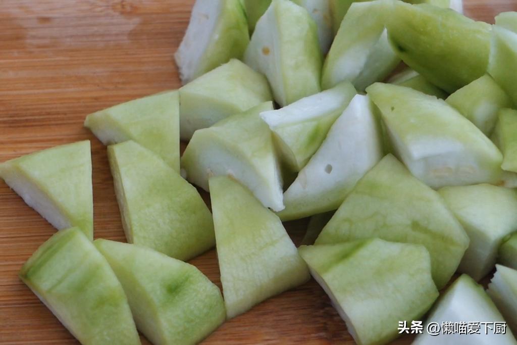 1、絲瓜去皮洗淨,切成滾刀塊;