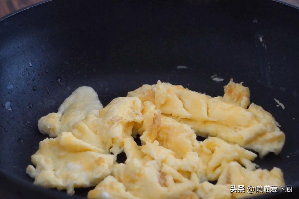 2、雞蛋敲入碗中攪勻,再下油鍋中煎成型,鏟成小塊備用;