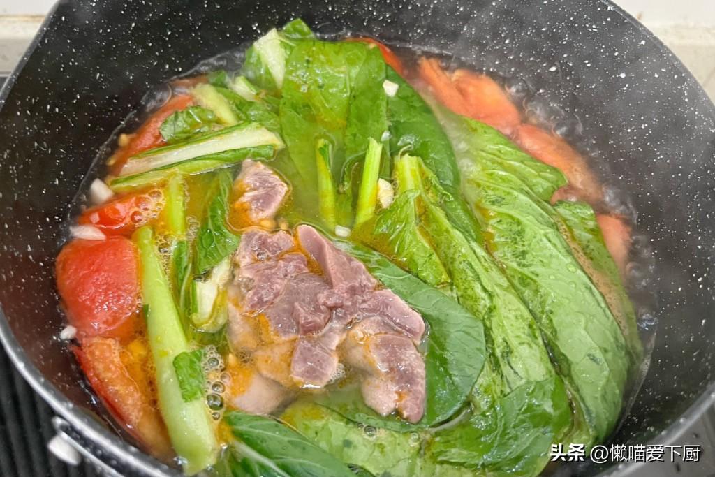 4、往鍋中加適量熱水,水開後倒入豬肝,再放些自己愛喫的青菜;