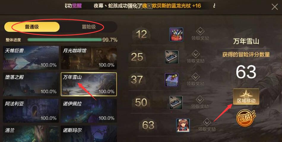 點擊右下角的“冒險”——冒險獎勵,從這裏就可以看到各個大區域的劃分;