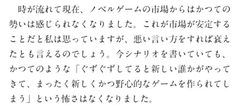 Key社20週年的時候,業界知名寫手田中羅密歐曾爲Key獻上寄語,這位如今已年過半百的老前輩提到:“隨着時間的流逝,如今在視覺小說遊戲市場裏已經感受不到昔日的勢頭了。這是市場穩定的表現,但要說得難聽點的話,也可以說是市場衰落了。現在寫劇本,再也不會有以前那種‘如果拖拖拉拉的話,就會有新人出現,製作出嶄新且野心勃勃的遊戲’的恐懼了。”