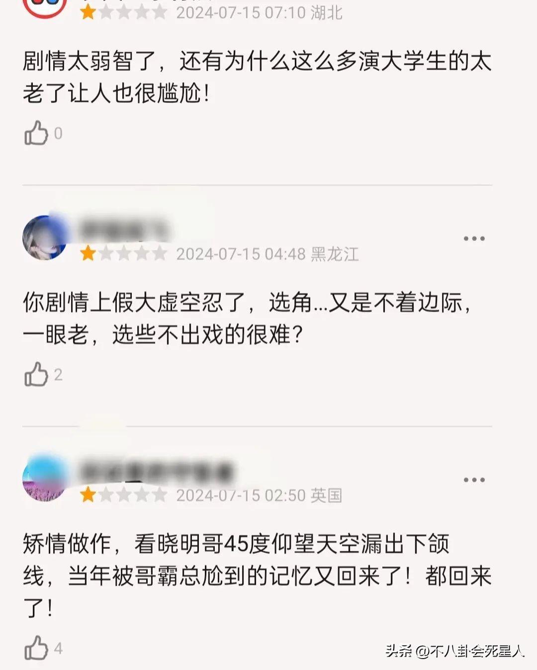 這樣的女主真是無語,男主也難以形容,表面上吹得很厲害,實際上不過爾爾。這部劇開播後,滿屏一星差評,觀衆的評論幾乎一致,主要是說兩個方面,一是吐槽全員裝嫩,二是劇情懸浮,讓人出戏,沒有代入感。