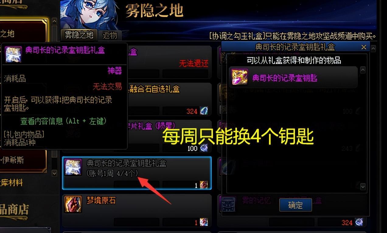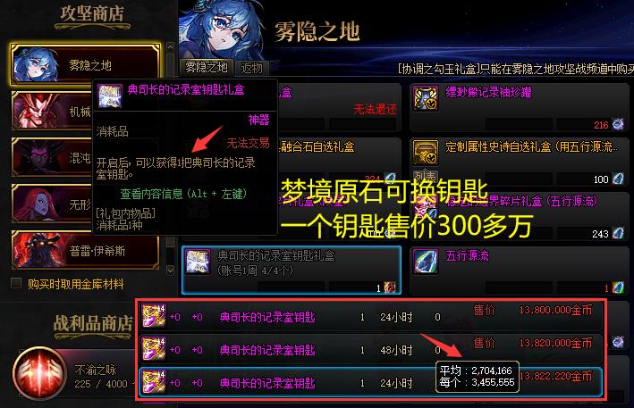我們可以在霧神商店中,把“夢境原石”換成“記錄室鑰匙禮盒”,兌換比例1:1,目前拍賣行中,1個記錄室鑰匙售價在300萬左右;