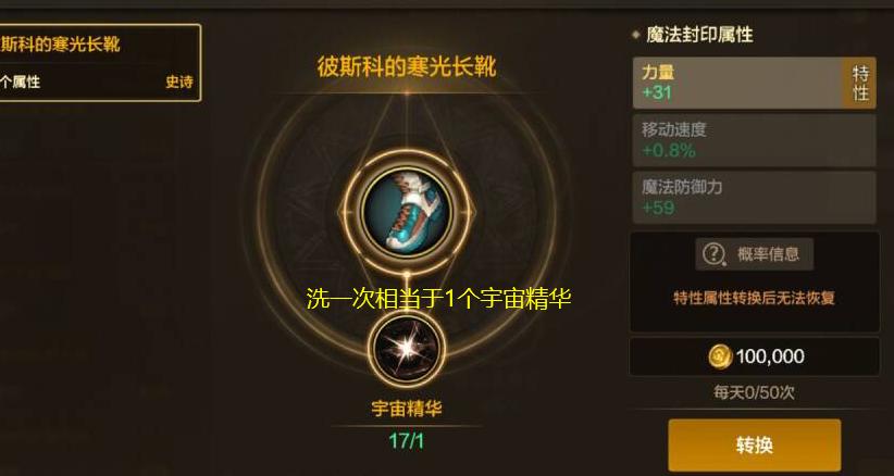 每一件史詩裝備剛爆出來的時候,都可以開一次“裝備詞條”,洗一次大詞條實際上還挺珍貴的,比如武器部位的5%傷害、首飾的7屬強等;