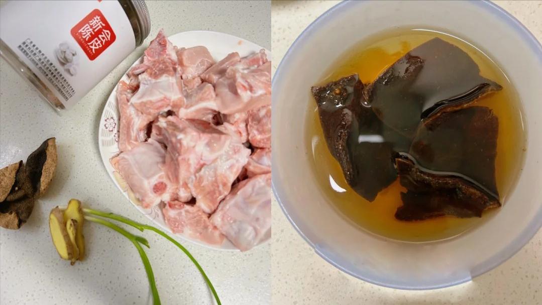 1、陳皮放入清水浸泡30分鐘,把反面泡軟的筋絡用刀颳去,撕成小塊。