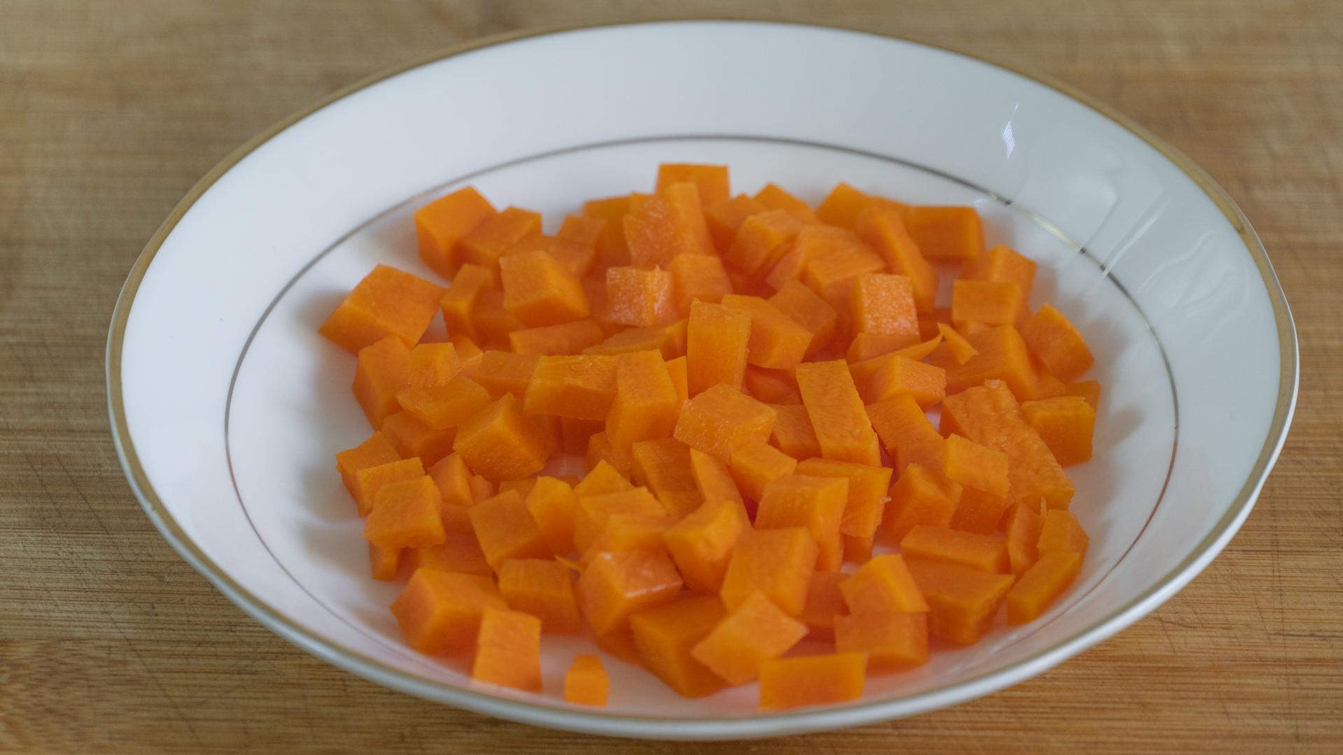 5、胡蘿蔔1小段就夠了,去皮後切成丁。