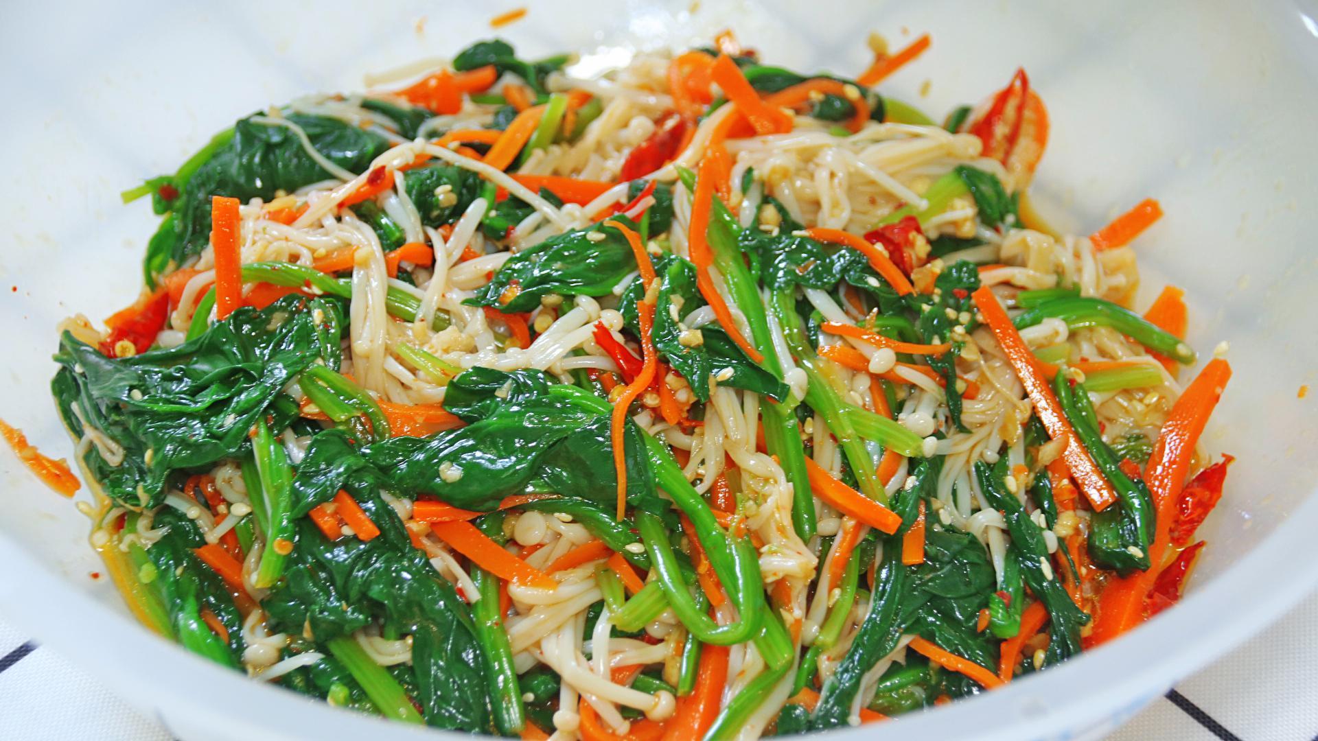 4、鍋中水開後放入鹽和食用油,分別下入胡蘿蔔絲、金針菇、菠菜根、焯燙十幾秒後,再下入菠菜葉稍微的焯燙一下;