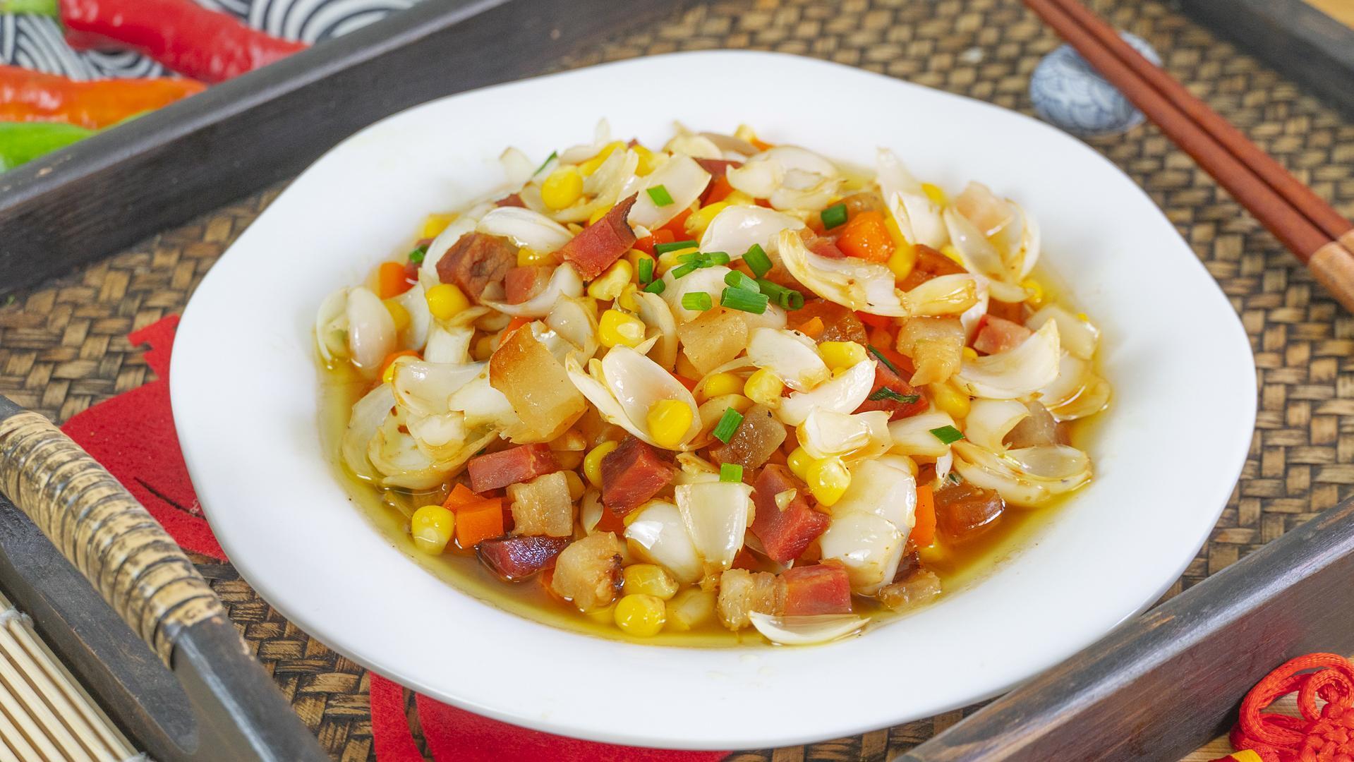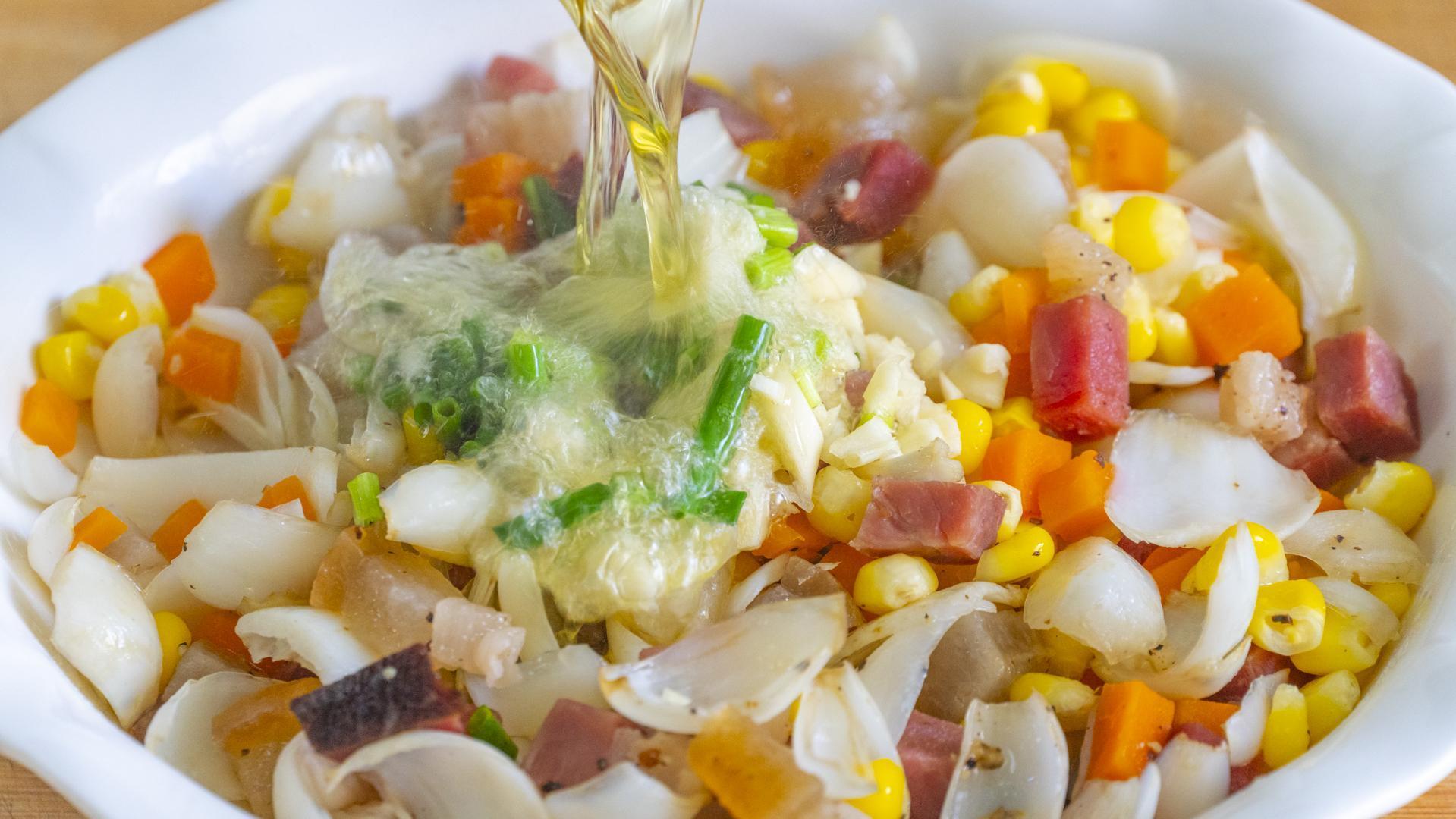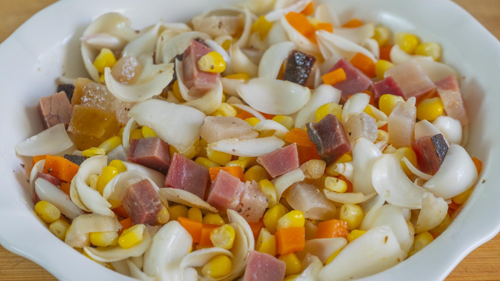 7、準備一個大碗,把焯過水的玉米、胡蘿蔔倒進來,接着把百合和臘肉丁也倒進來。拌勻後簡單的調味,一點點的糖、少許雞精和胡椒粉,攪拌均勻就可以了。
