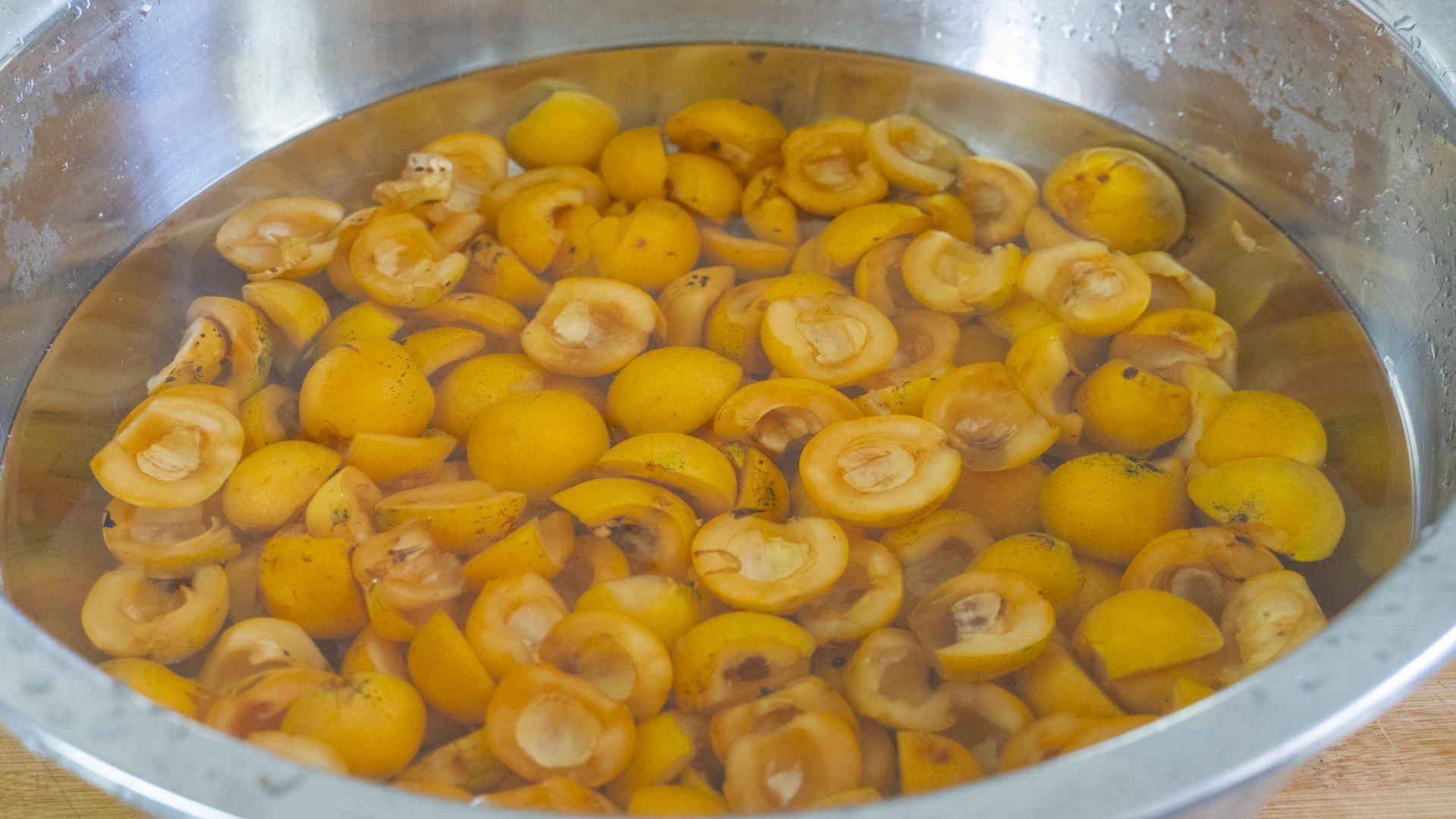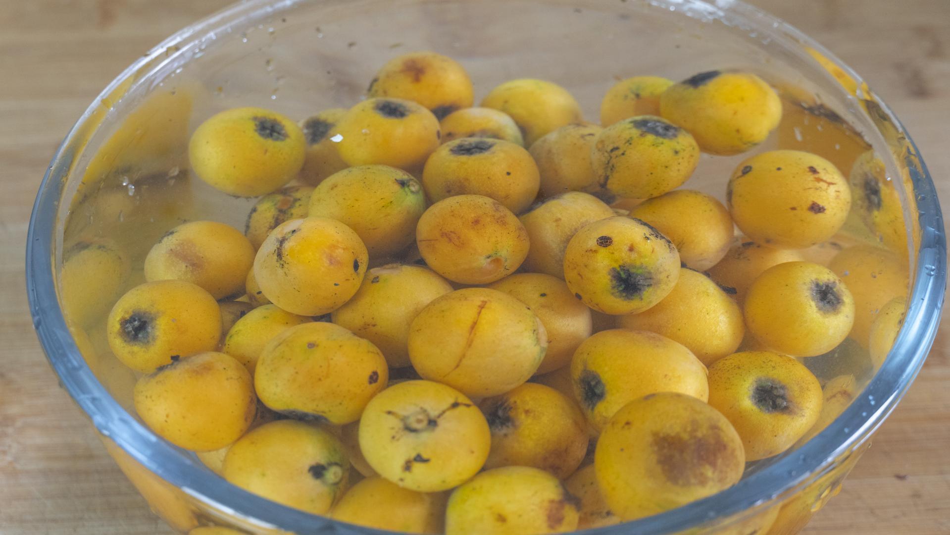 2、兩頭削一下,然後給枇杷去核,不用去皮,一起煮就行。