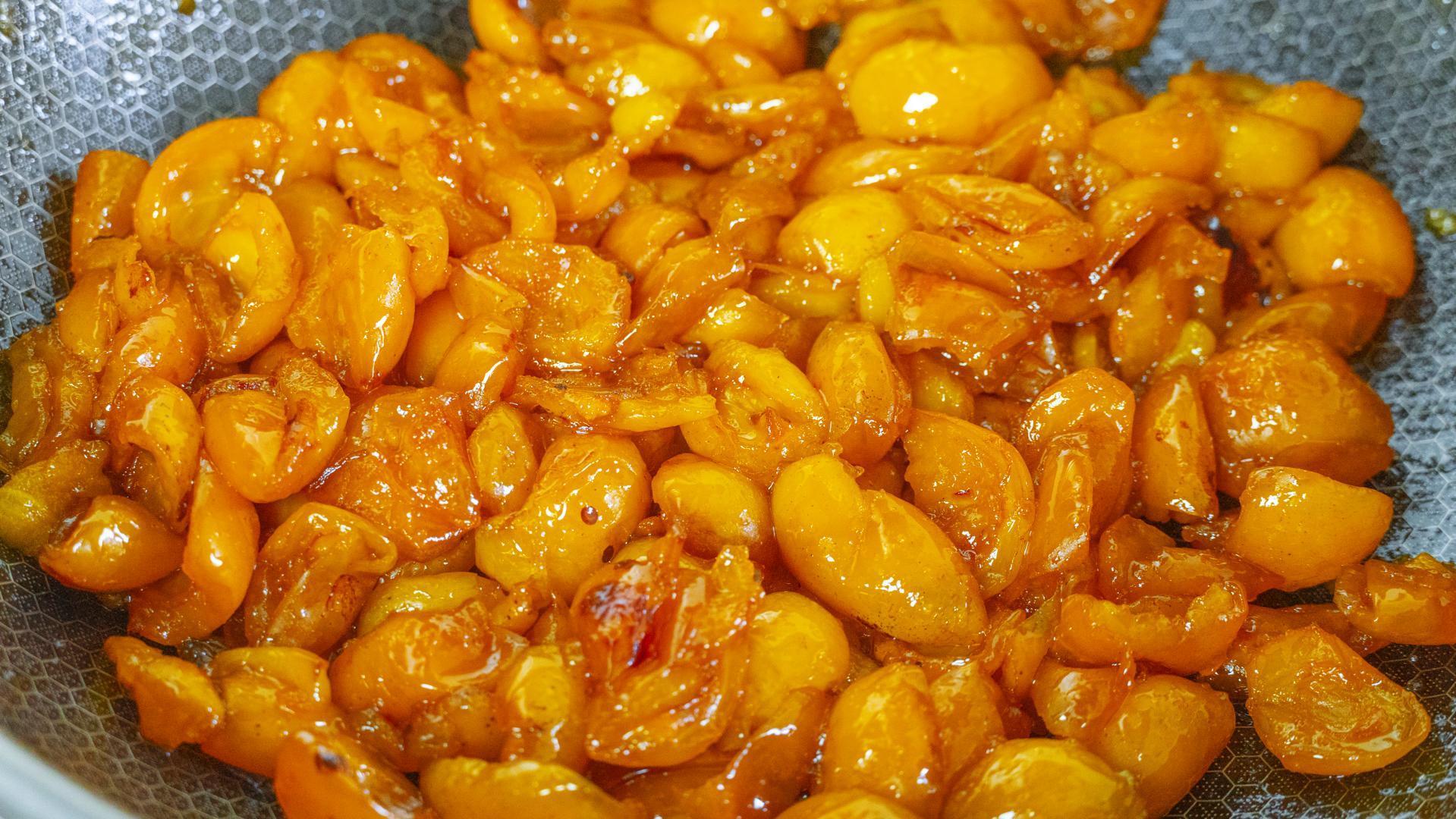 4、不用加水,直接讓枇杷和冰糖一起熬就行,慢慢的枇杷裏面的汁水會出來,蓋上鍋蓋,小火慢慢地煮約30分鐘左右。