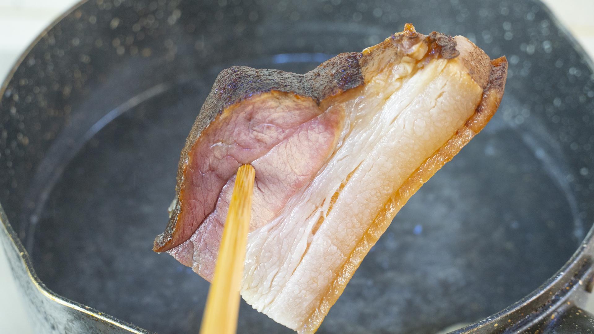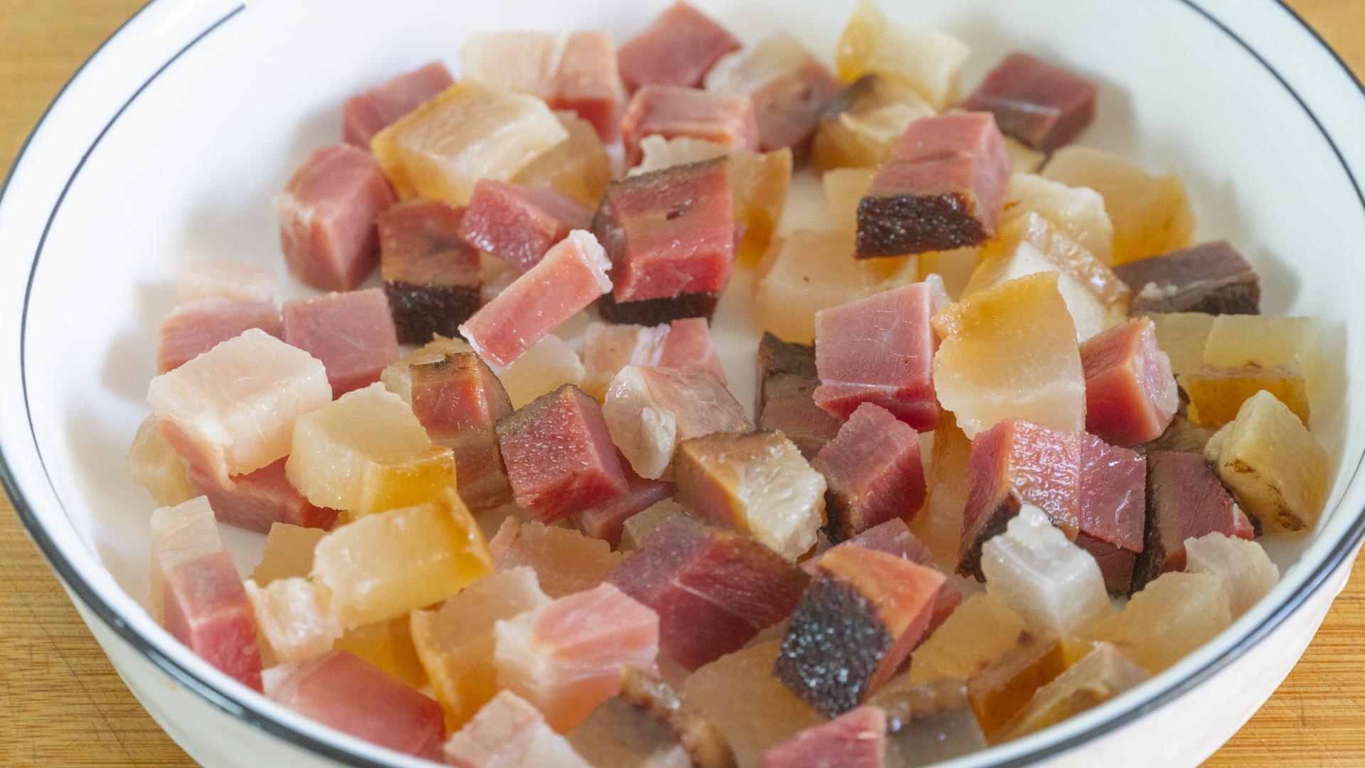 1、臘肉1小塊,先清洗乾淨。起鍋燒水,冷水下入臘肉煮,先把臘肉煮一會兒。
