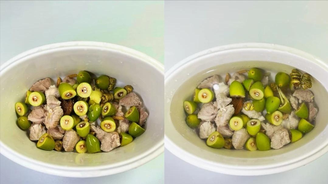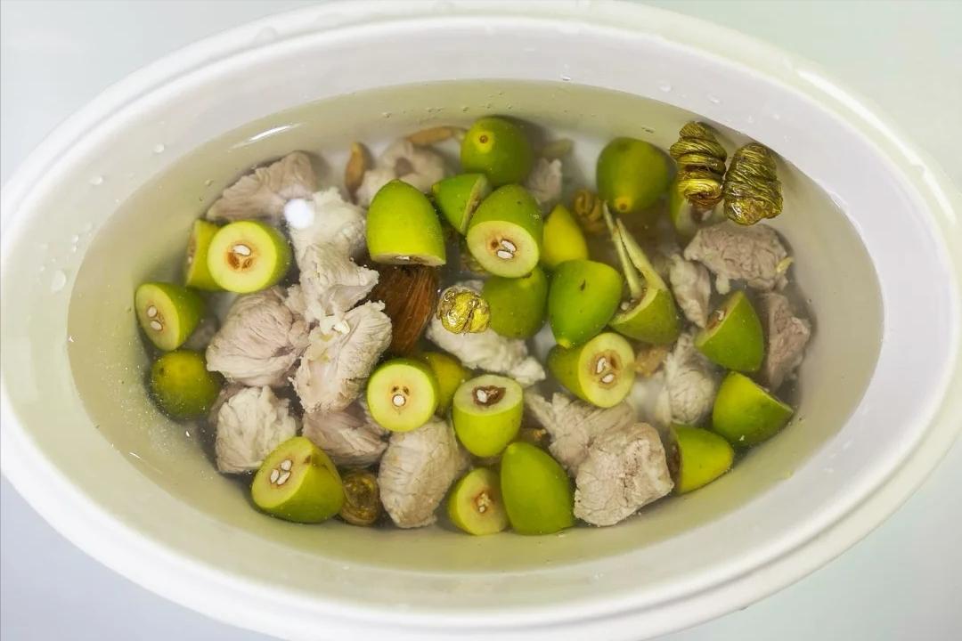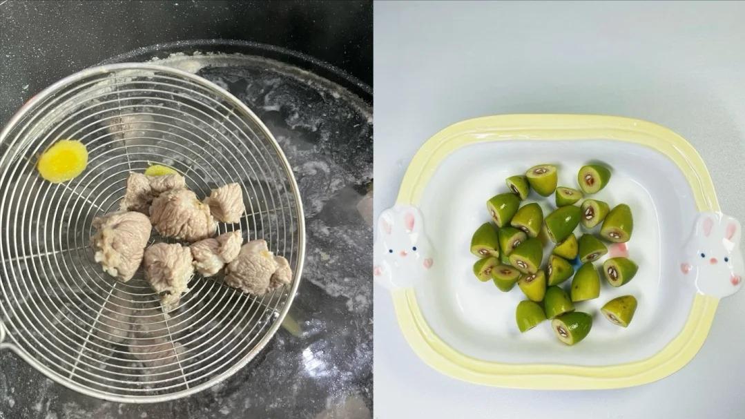 1、將青橄欖和瘦肉洗淨切塊備用,瘦肉和生薑焯水撈出。