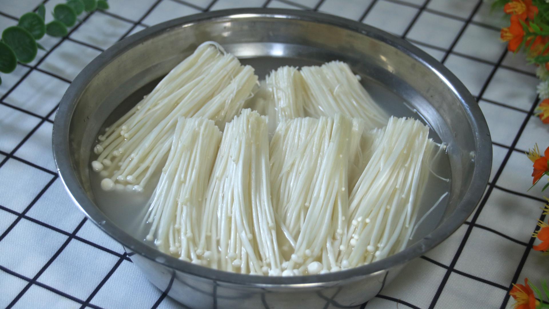 1、主要食材就是金針菇、菠菜、胡蘿蔔,首先金針菇去掉根部,用手撕成小朵,放入淘米水中浸泡10分鐘 ,然後水開大多衝洗幾遍;
