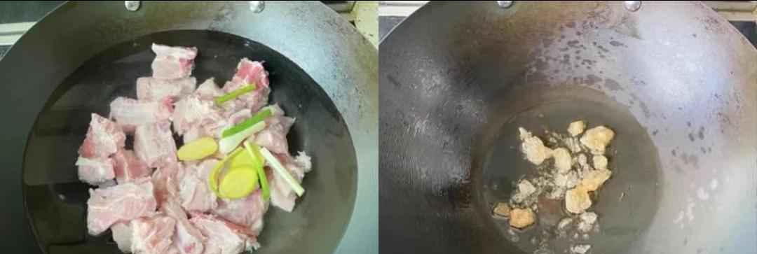 3、排骨涼水下鍋,加蔥姜料酒焯水撈出。