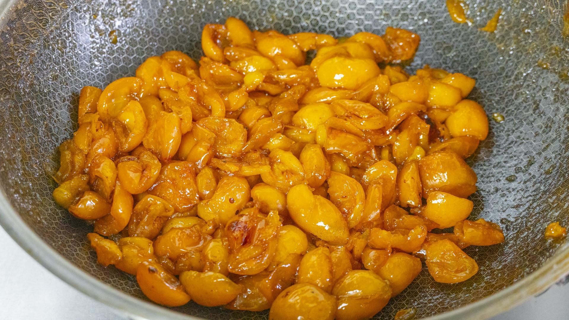 5、我們可以用筷子或者勺子試一下枇杷的軟硬程度,如果感覺很容易就能搗碎,就說明枇杷膏已經煮好了。