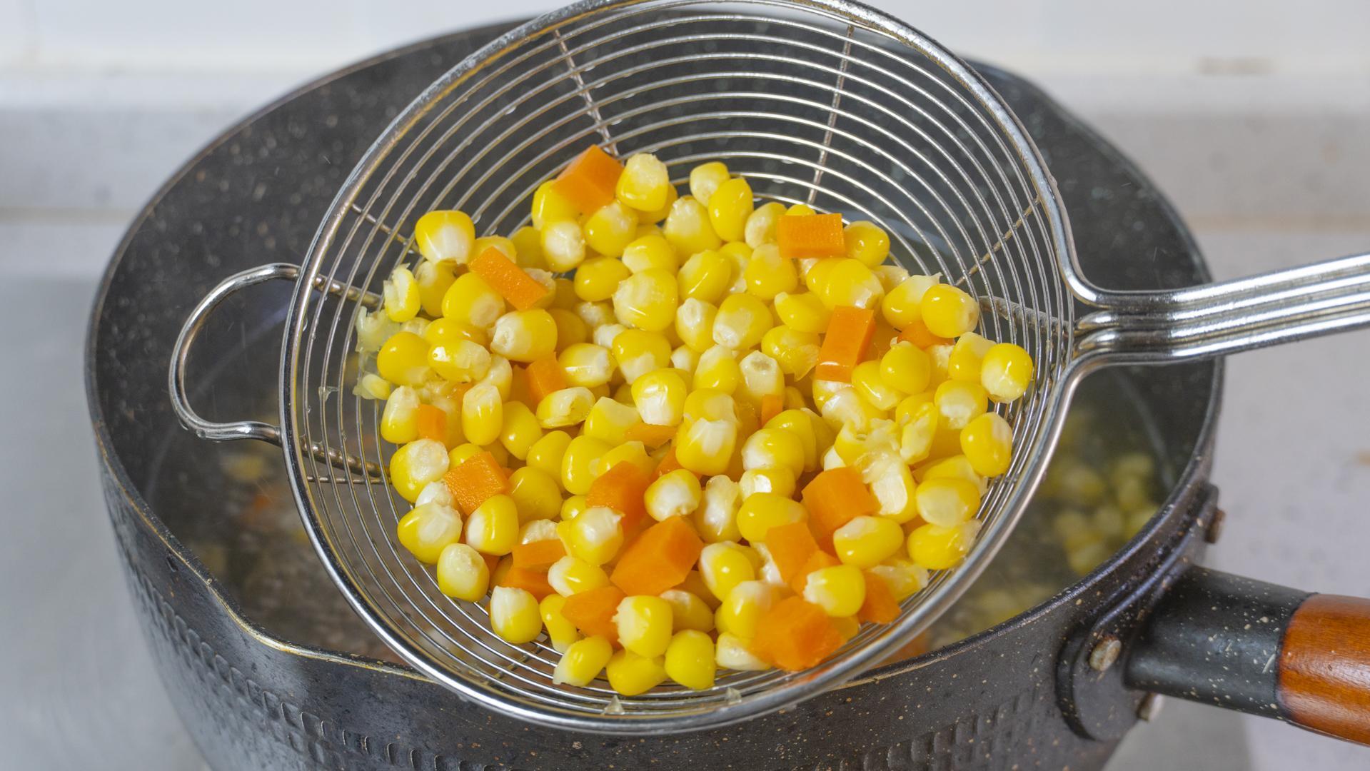 6、起鍋燒水,加一勺鹽和一勺食用油。水開倒入玉米粒和胡蘿蔔焯水,1分鐘後立馬撈出來。放到涼水裏面過一下控幹水分就可以了。