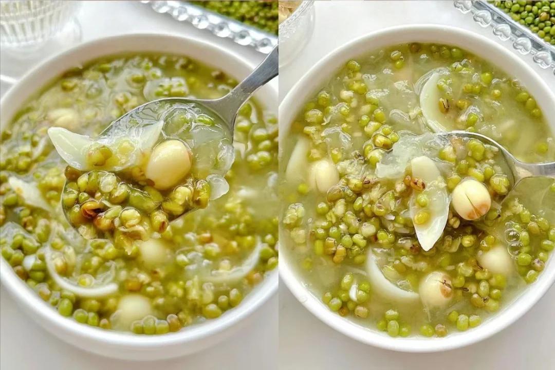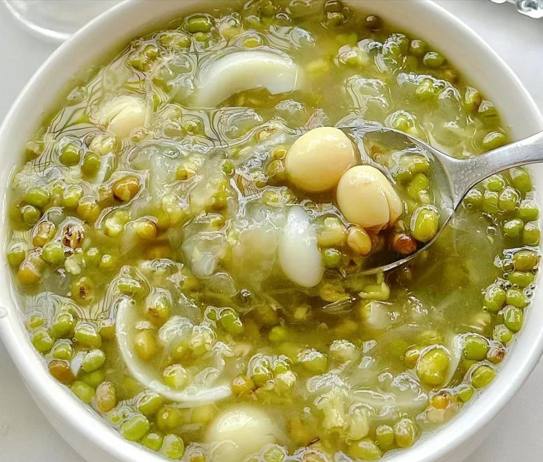 4、大火煮沸後轉小火慢燉,直至綠豆開花,蓮子軟糯。